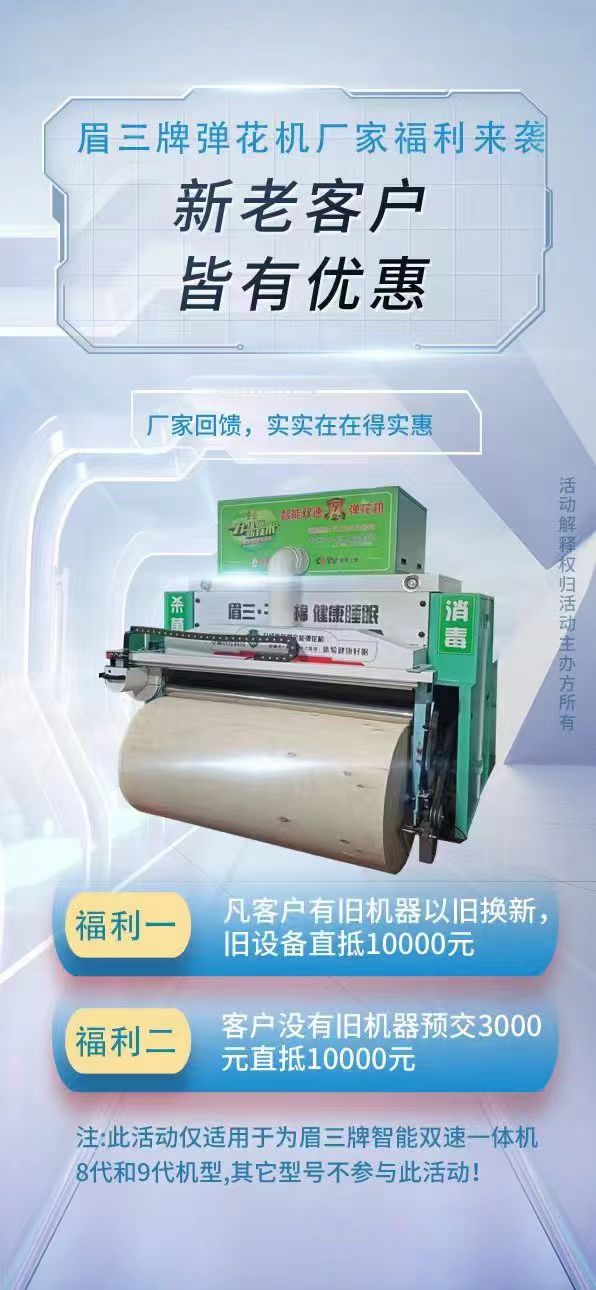 特惠活动:为了回馈老顾客,优惠新客户。眉三牌弹花机厂家特推出:①凡客户有旧机器以...